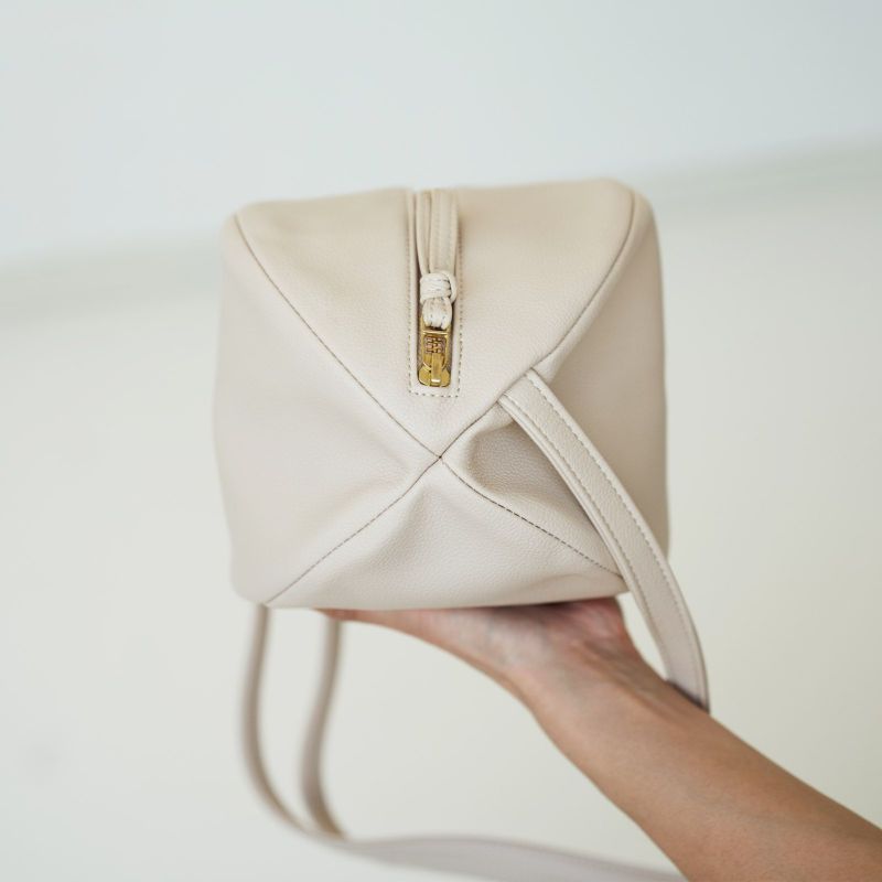 ころんとした見た目もほっこり可愛く大きく開く間口やファスナー開閉にもストレスゼロな使い心地にこだわって作られた一点です。
