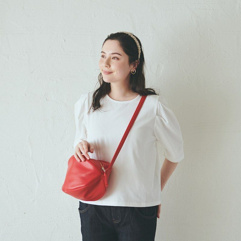 ころんとした見た目もほっこり可愛く大きく開く間口やファスナー開閉にもストレスゼロな使い心地にこだわって作られた一点です。