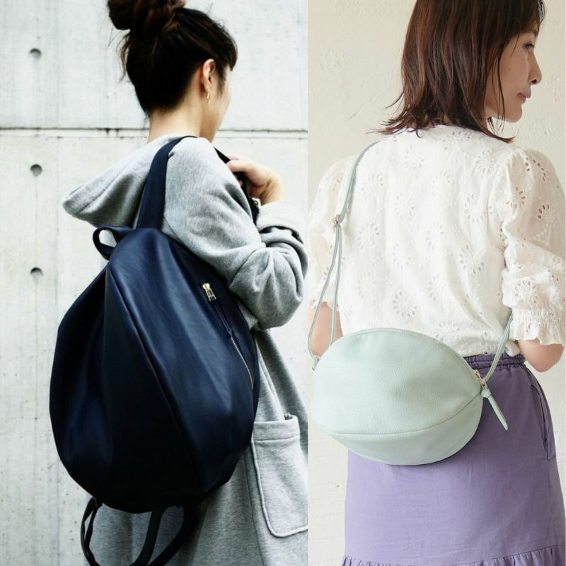 ころんとリュックLは、puレザーできれい目の装いにもフィットします。