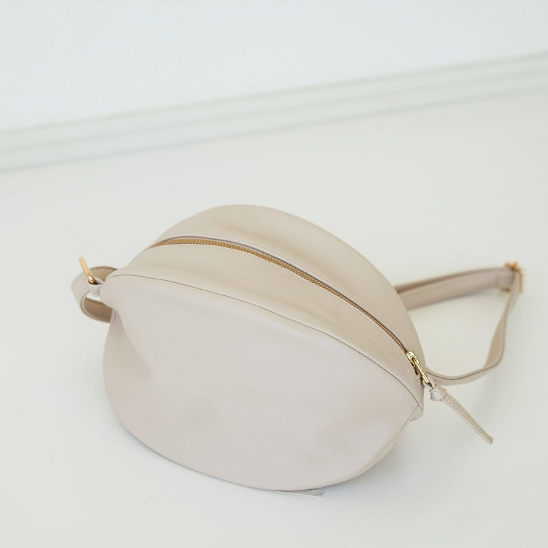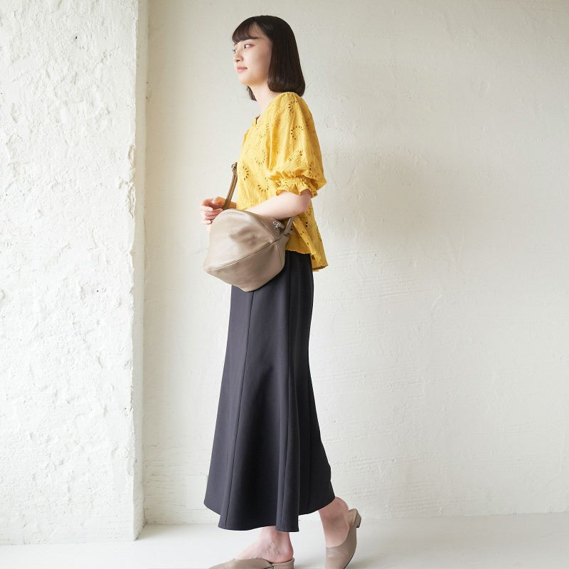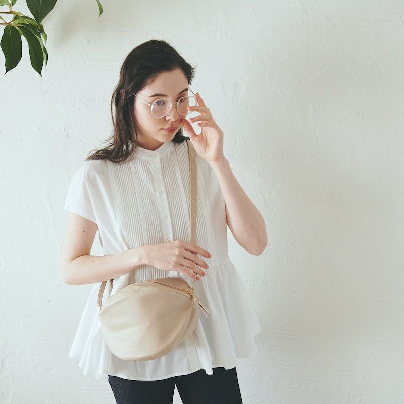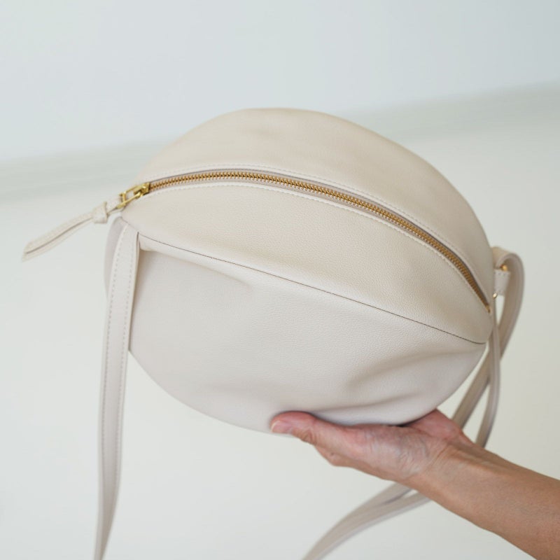 ころんとした見た目もほっこり可愛く大きく開く間口やファスナー開閉にもストレスゼロな使い心地にこだわって作られた一点です。