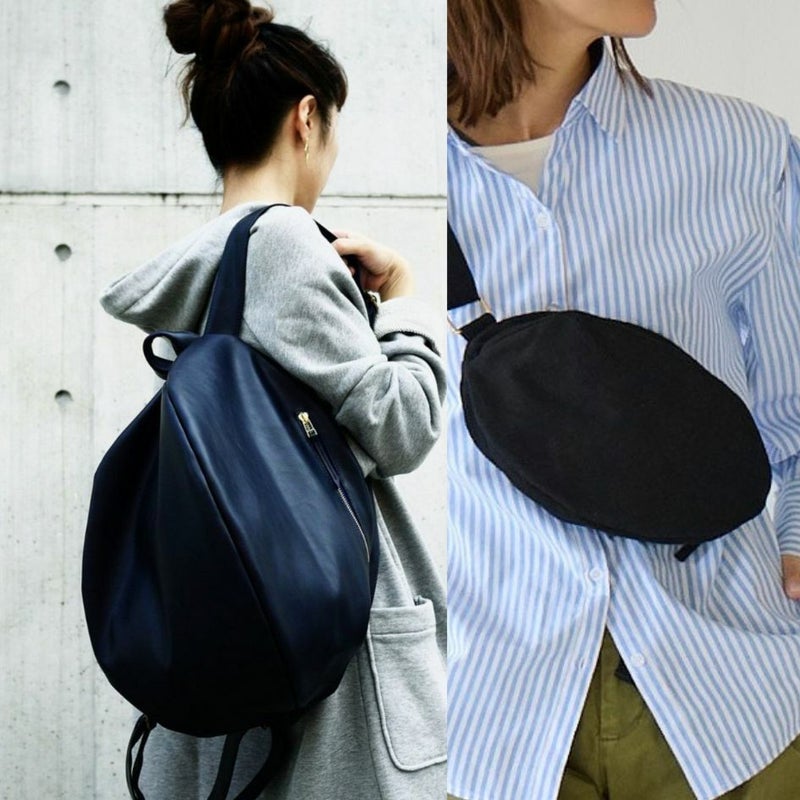 ころんとリュックLは、puレザーできれい目の装いにもフィットします。