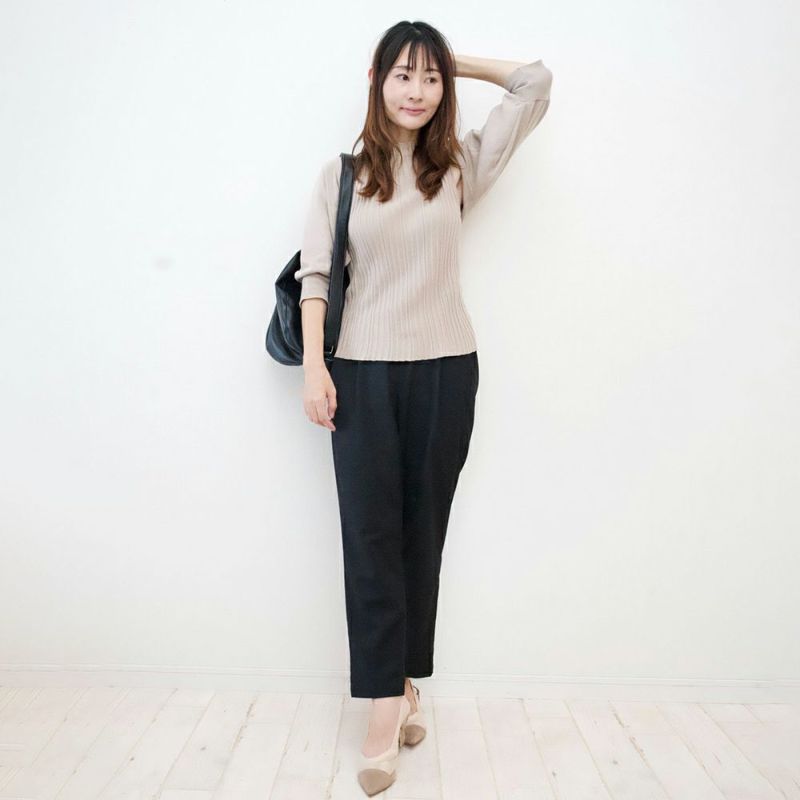 158センチ、普通より少し細身、おそらく骨格ウェーブで、太モモとお尻の境界がないよねと夫と娘に言われている、まさに日本人体型アラフォーです。なので、今までは専らロングスカート派だったのですが、骨格ウェーブさんはタックパンツ似合うというコラムを読んで、数年ぶりにパンツに挑戦してみました。  全然、苦しくなくて、しかも、着痩せ効果がものすごいです。着こなしの幅が広がり嬉しいです。一緒に購入したニットと合わせています。
