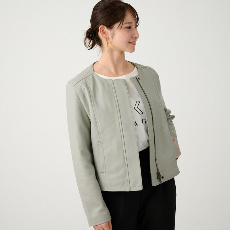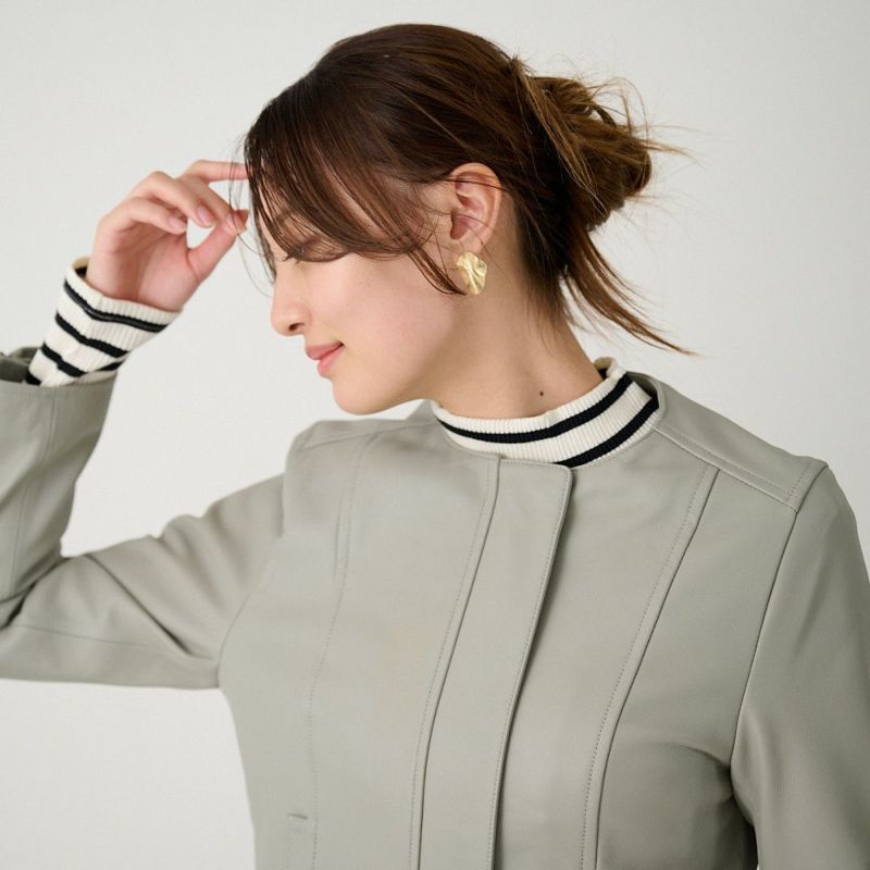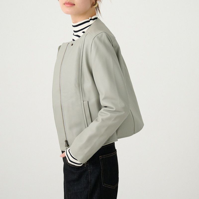 首元をすっきりと魅せるノーカラー(襟がない)デザインは、レザー特有のハード感を感じさせず、エッジが効いてこなれた印象へ格上げしてくれます。
