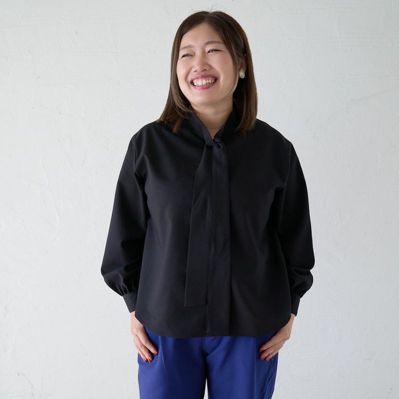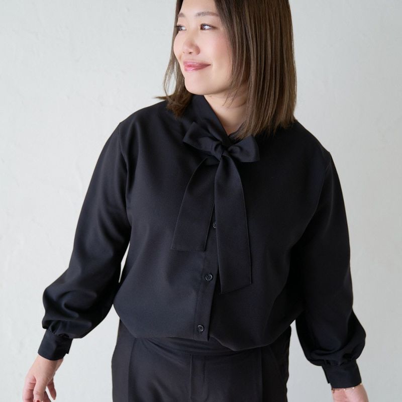 とろみ素材ボウタイ長袖ブラウス(ブラック)