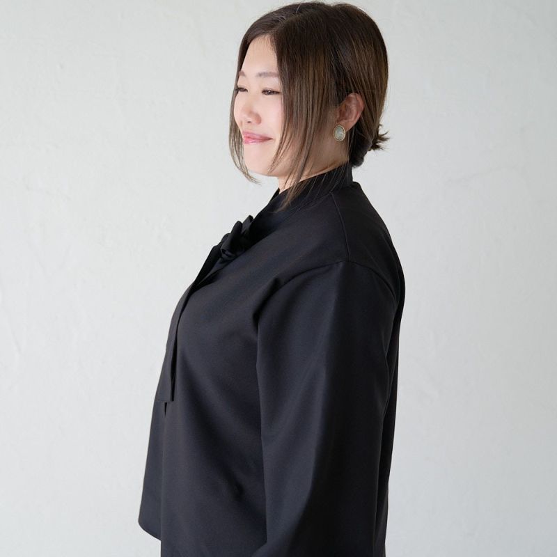デザインのポイントは、首元のボウタイ。結び方次第で印象を変えられ、シンプルに垂らしても、きちんとリボン結びにしても美しく決まります。