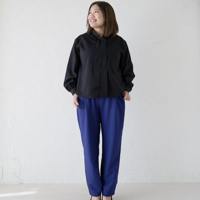 こちらはビジネスシーンはもちろん、入学式・卒園式などのママコーデにも活躍する、とろみ素材のボウタイブラウス。毎日のコーデに取り入れやすく、きちんと感と女性らしさを両立させたデザインです。LL-3Lくらいのサイズ感になります。
