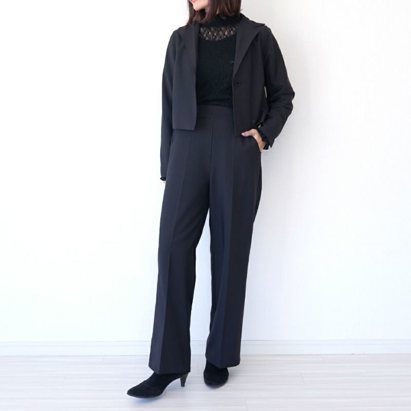 着やすいショート丈のジャケットだから、セットのパンツはもちろん、スカートやワンピース、デニムにだって(!)合わせやすく、使い勝手よしです。