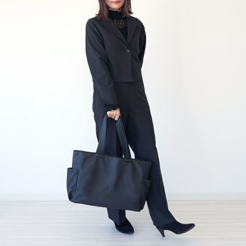 ウエストの後ろにゴムをいれてゆとりを持たせたパンツと、身幅ゆったりめジャケットで着心地が楽なこともポイント。