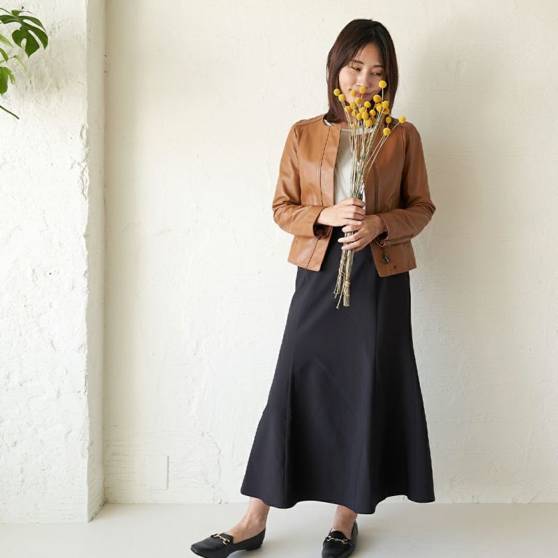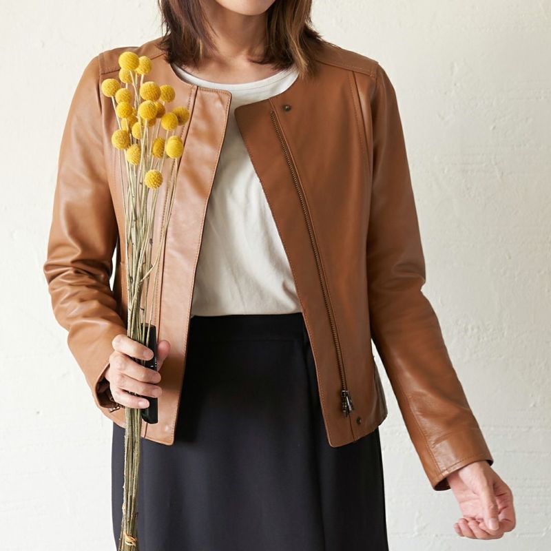 首元をっきりと魅せるノーカラー(襟がない)デザインは、レザー特有のハード感を感じさせず、エッジが効いてこなれた印象へ格上げしてくれます。