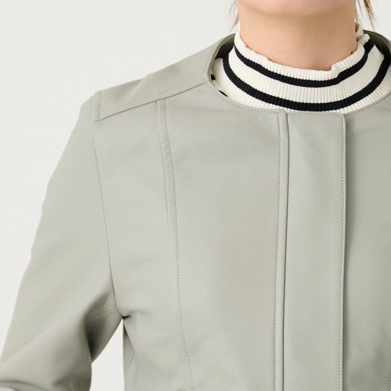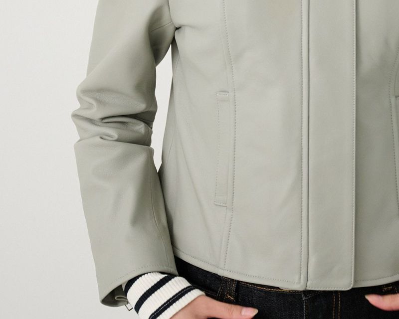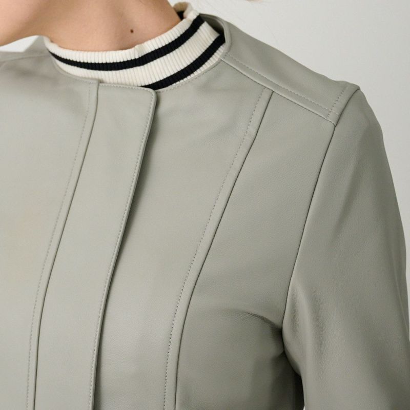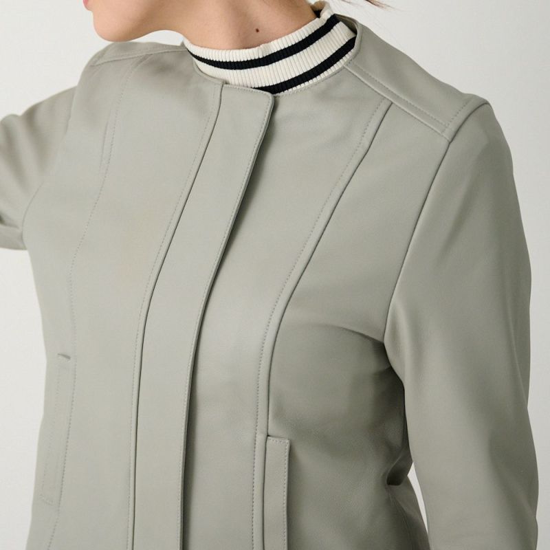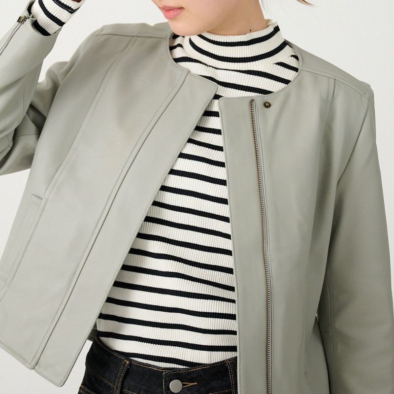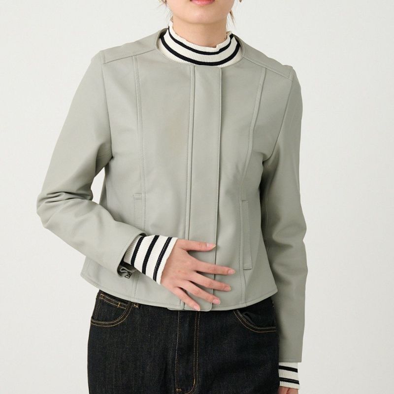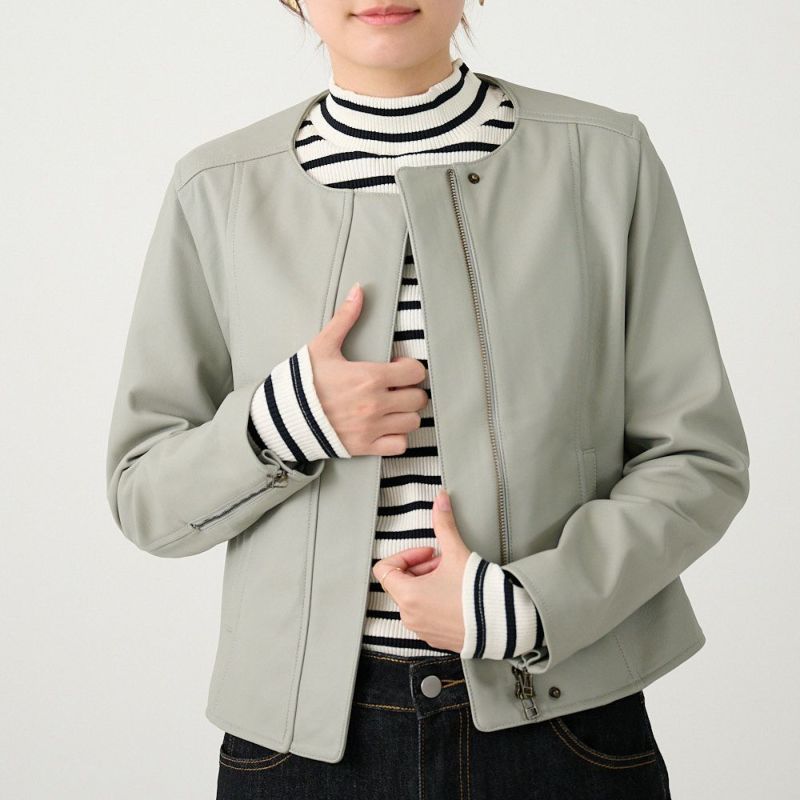 首元をすっきりと魅せるノーカラー(襟がない)デザインは、レザー特有のハード感を感じさせず、エッジが効いてこなれた印象へ格上げしてくれます。