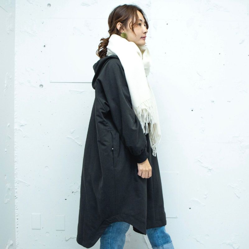 暖かさ重視のロング丈にフード。さらにストールや手袋をプラスすれば、極寒の時期にもポカポカです。
