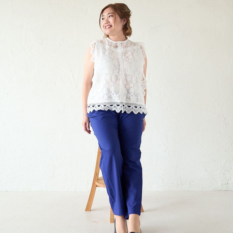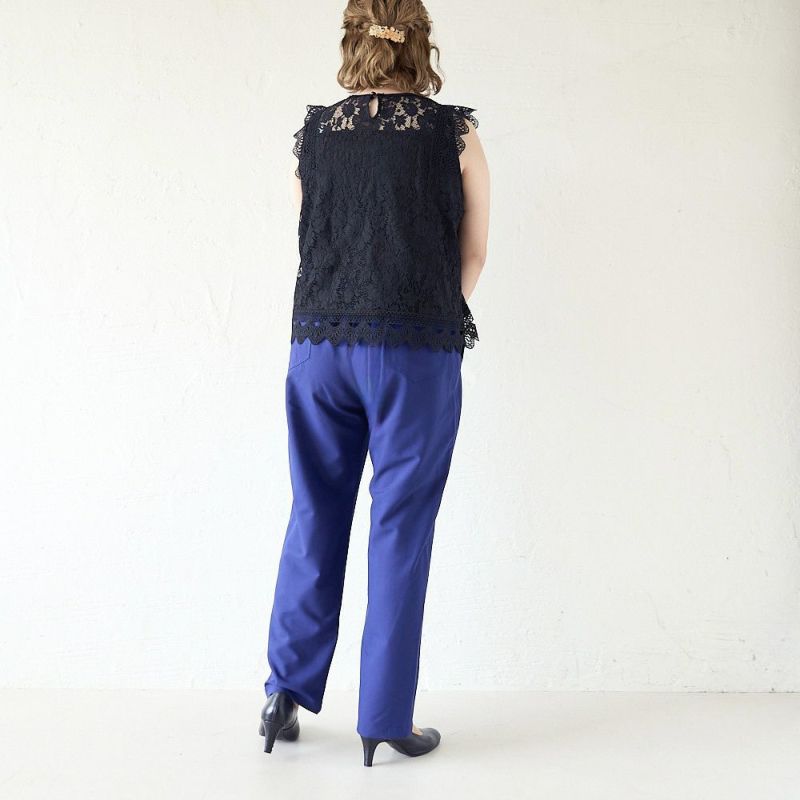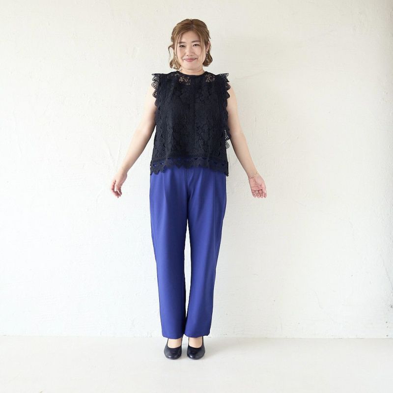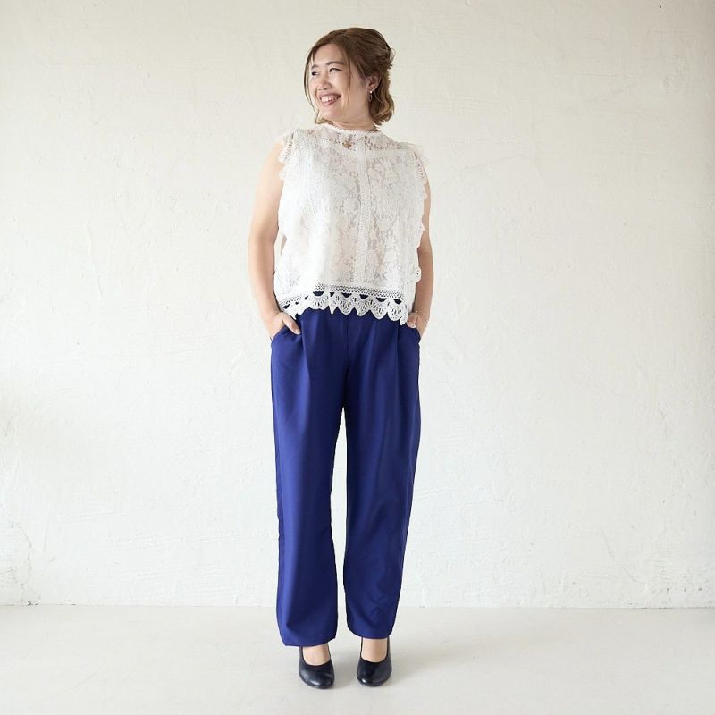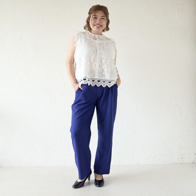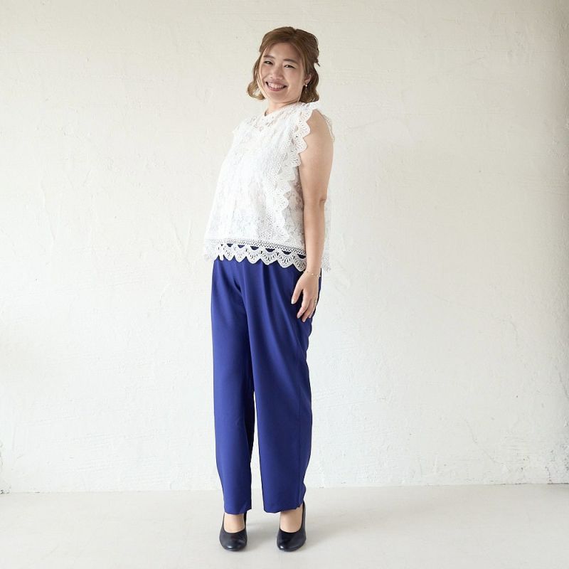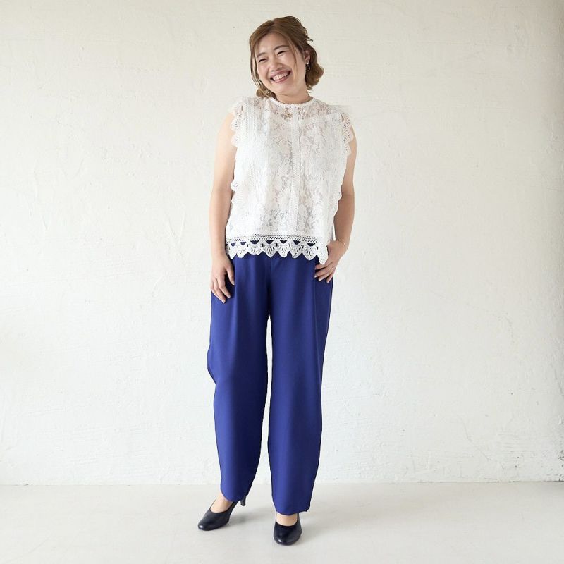 ウエスト約80cm、ヒップ約108cmくらいまで対応!細すぎず太すぎない、計算されたシルエットだから体のラインを拾いすぎず、すっきり見せてくれる“着痩せパンツ”。