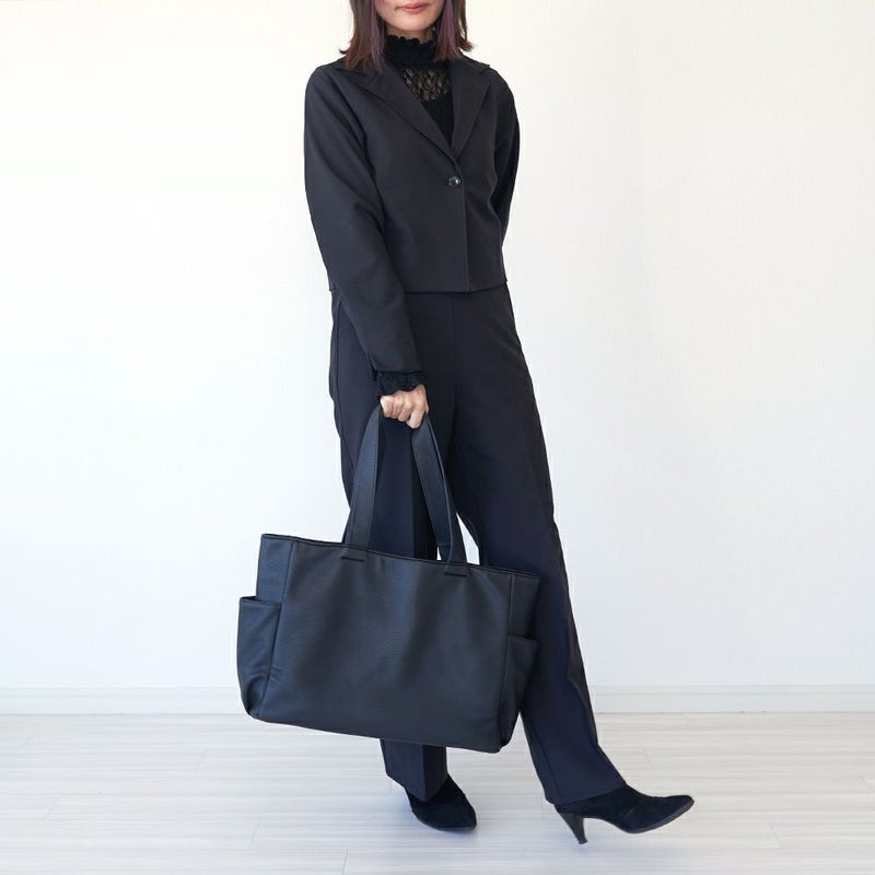 ウエストの後ろにゴムをいれてゆとりを持たせたパンツと、身幅ゆったりめジャケットで着心地が楽なこともポイント。