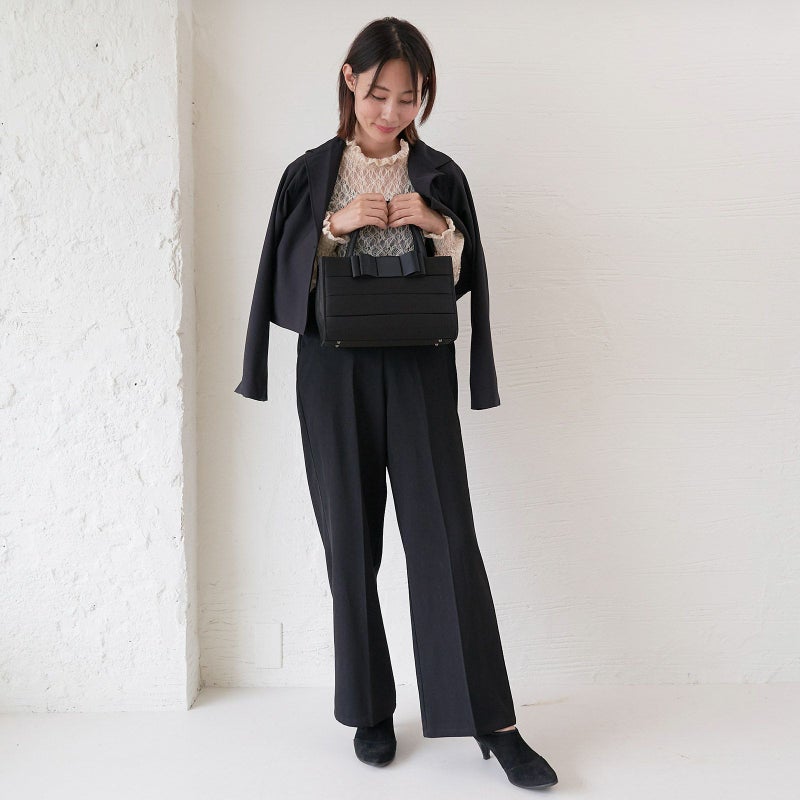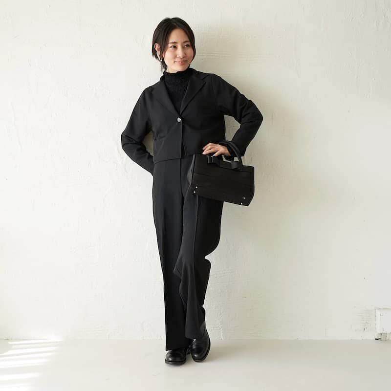 着やすいショート丈のジャケットだから、セットのパンツはもちろん、スカートやワンピース、デニムにだって(!)合わせやすく、使い勝手よしです。