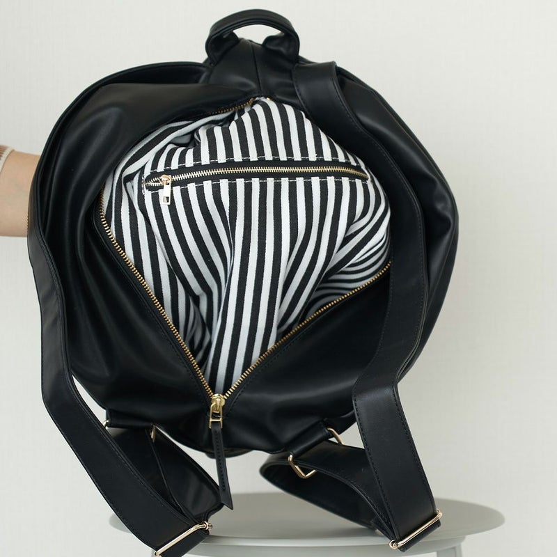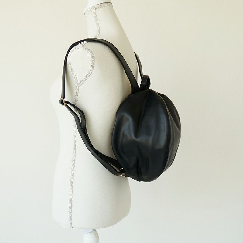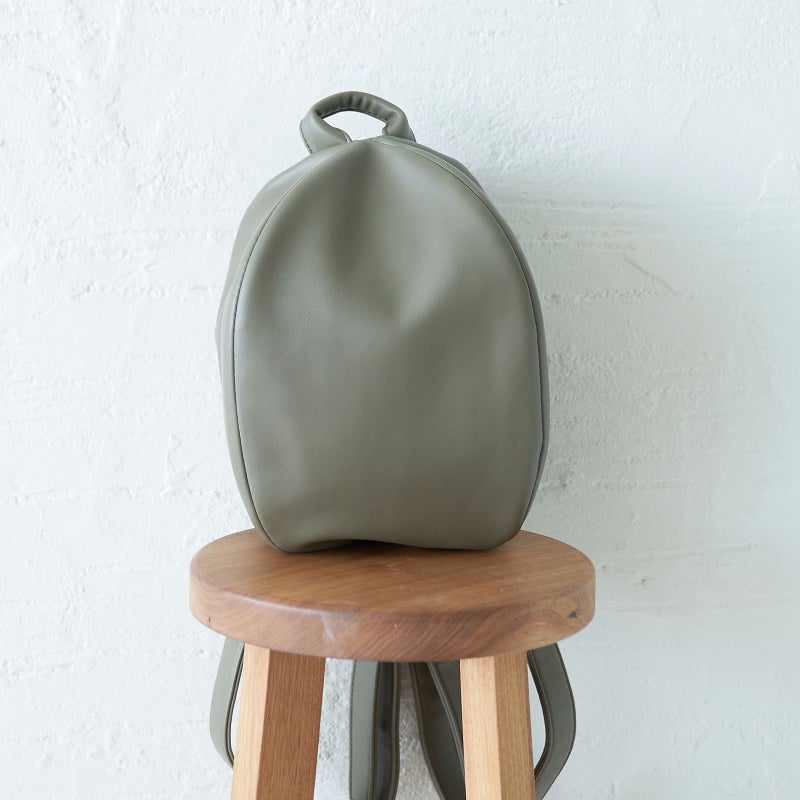ころんとリュックLは、puレザーできれい目の装いにもフィットします。
