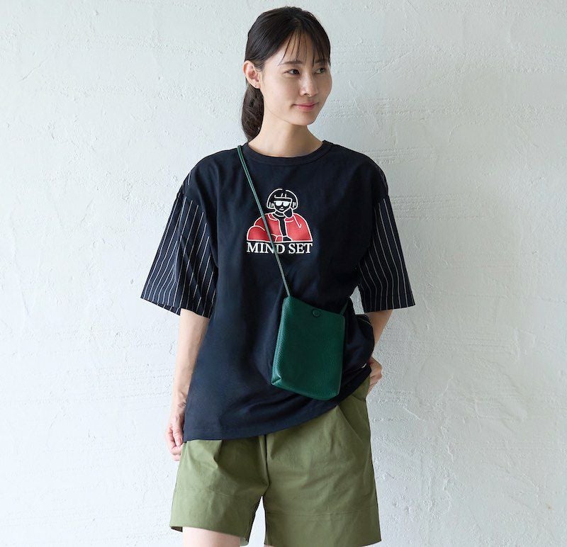袖がストライプのシャツに真ん中のプリントがちょこんと座っています