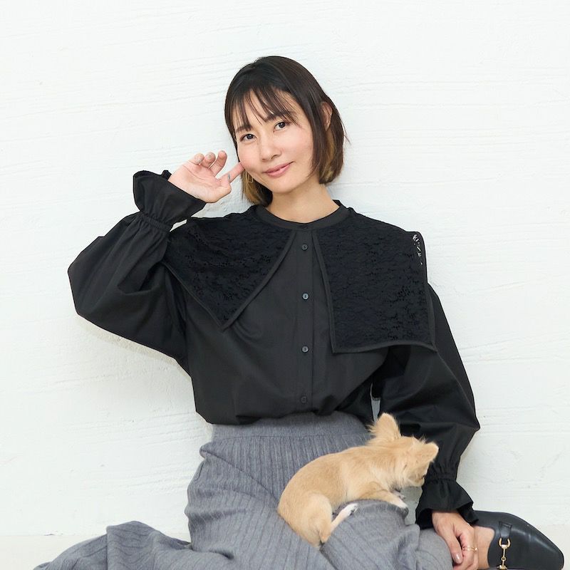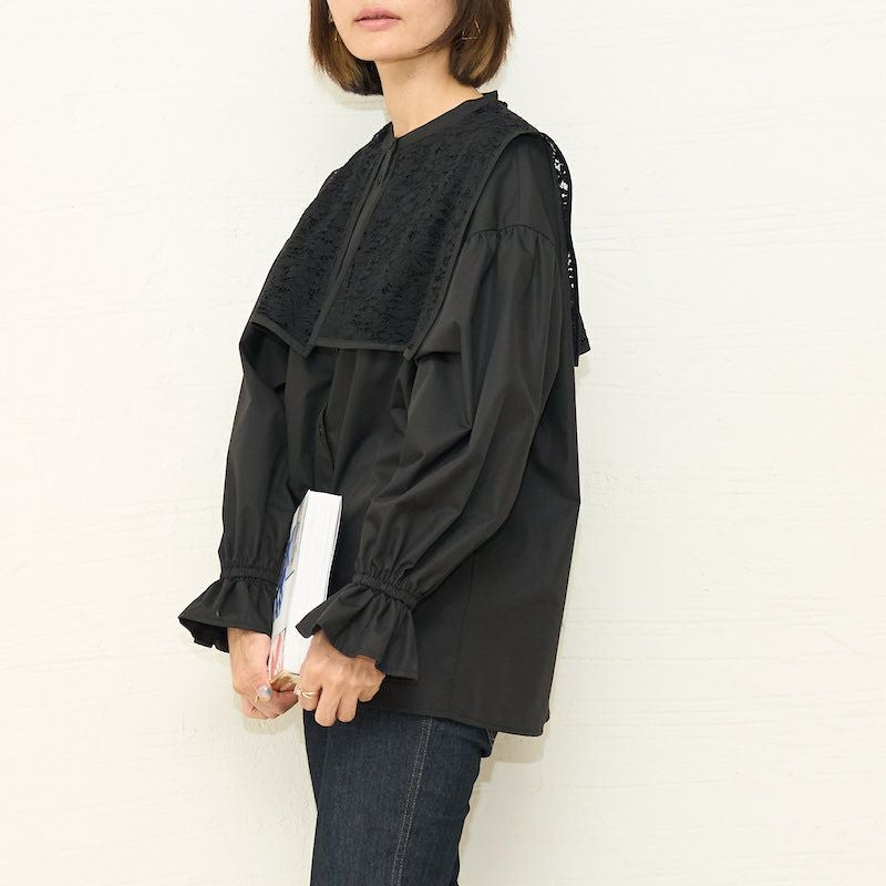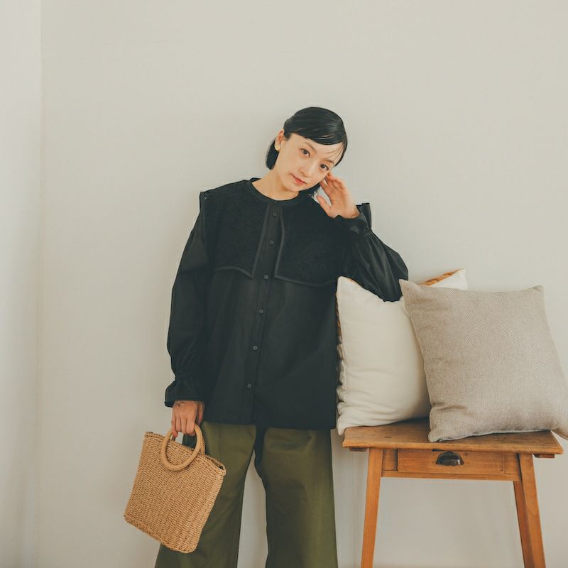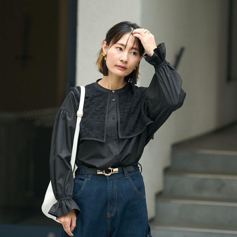 今季襟付きのブラウスはたくさん出ていますが中でもレースとドッキングが可愛いです。