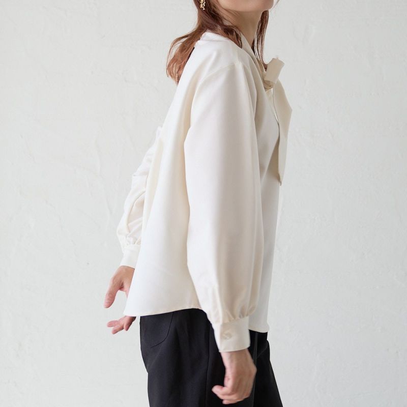 デザインのポイントは、首元のボウタイ。結び方次第で印象を変えられ、シンプルに垂らしても、きちんとリボン結びにしても美しく決まります。
