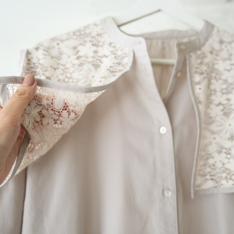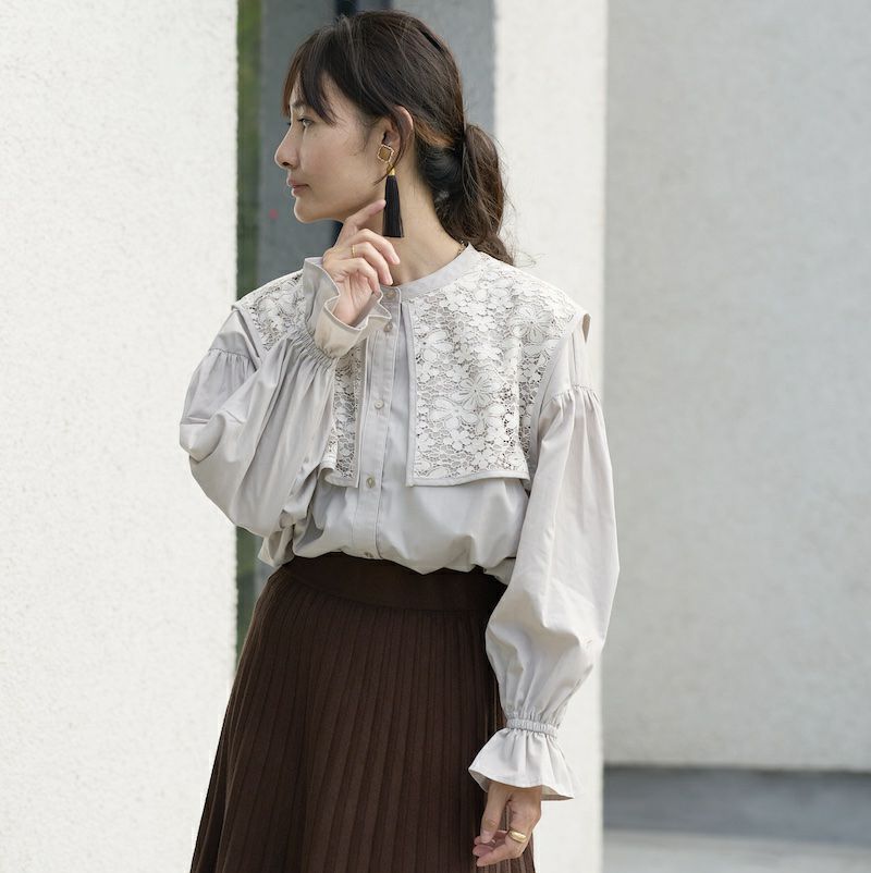 今季襟付きのブラウスはたくさん出ていますが中でもレースとドッキングが可愛いです。