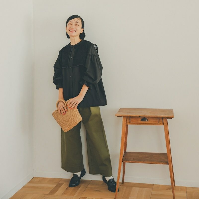 そんな時はコーデセットに頼っちゃいましょう。大人に似合うおすすめ大きい襟のデザインブラウスとワイドパンツです。