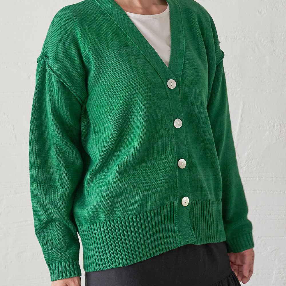 肩線が落ちていて、ほんの少しオールドな雰囲気のカーディガンは、即こなれ感が出て素敵です。