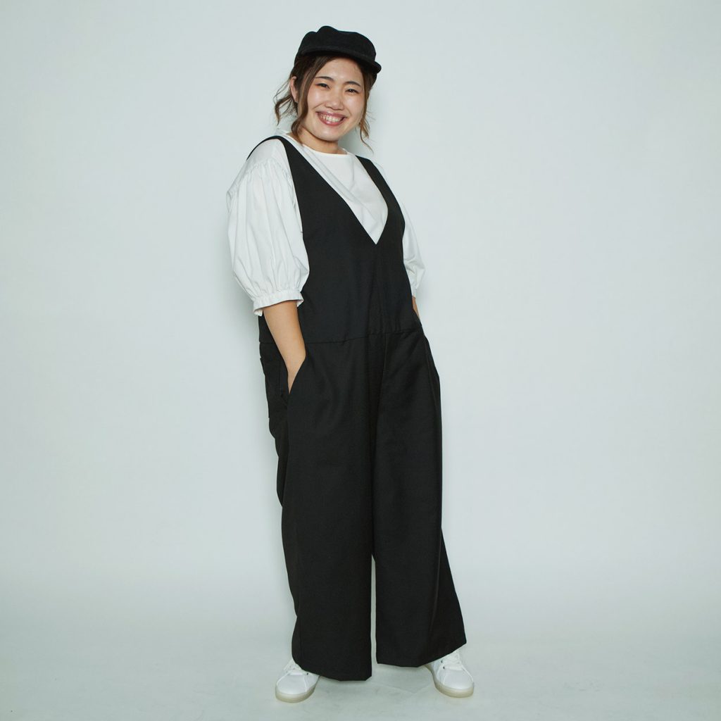3L〜5L、大きめサイズ(プラスサイズ)の、大人可愛いV空きサロペットです。