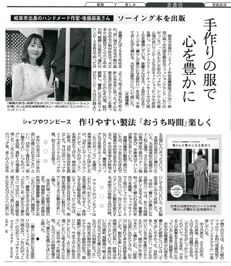 2020年9月2日 岐阜新聞に、もりのがっこうのこれまでのことと、2冊目のソーイング本『暮らしが 豊かになる服作り』について、取材いただきました。