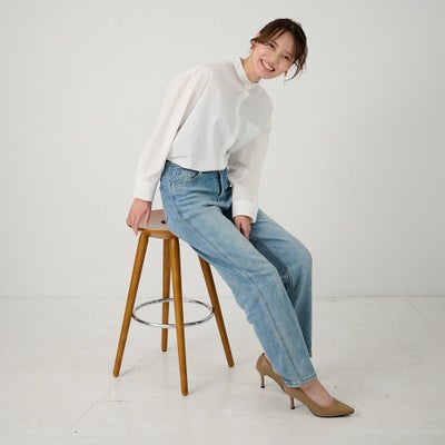 私の年代の方が履くのにも丁度良いブルージーンズです。色合いは薄すぎず、濃すぎず。生地の厚さもスタスタ歩くのを邪魔しない、しなやかで柔らかい生地です。脚のシルエットもワイドパンツとはいえ、太すぎないのでトップスにボリュームありでもOKです!