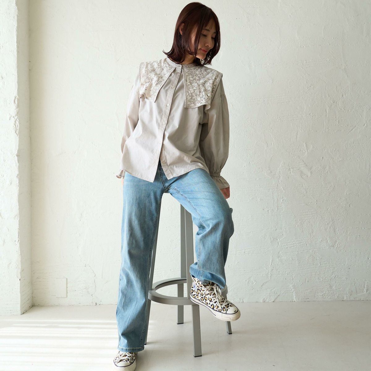 袖スリットリボン長袖シャツ(ライトグレー)
