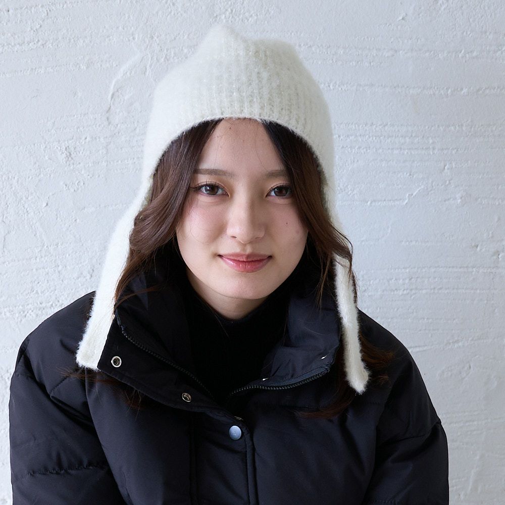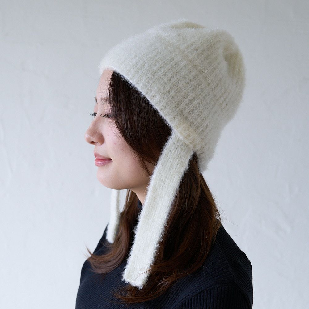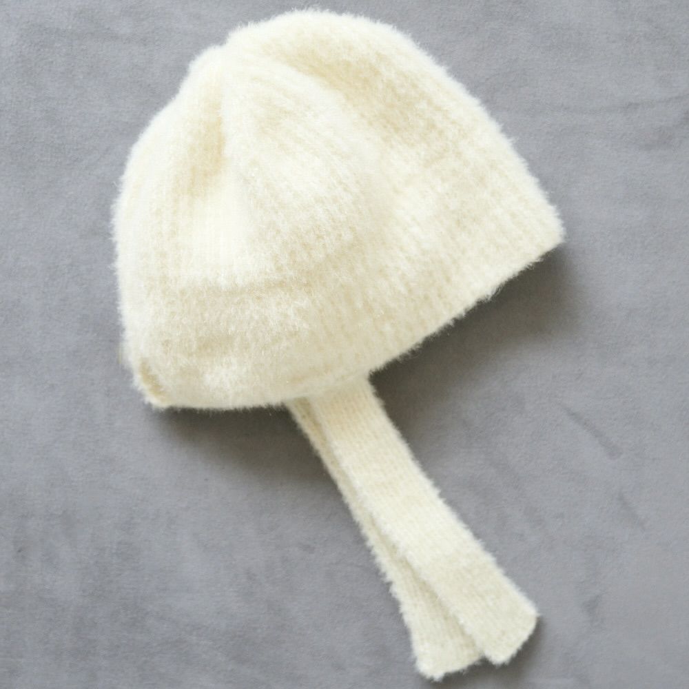 手編み 締め付け感のない 紐付きニット帽(ホワイト)
