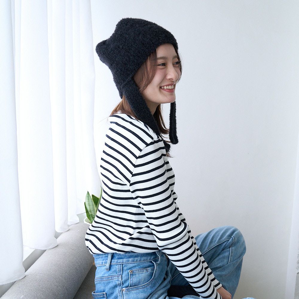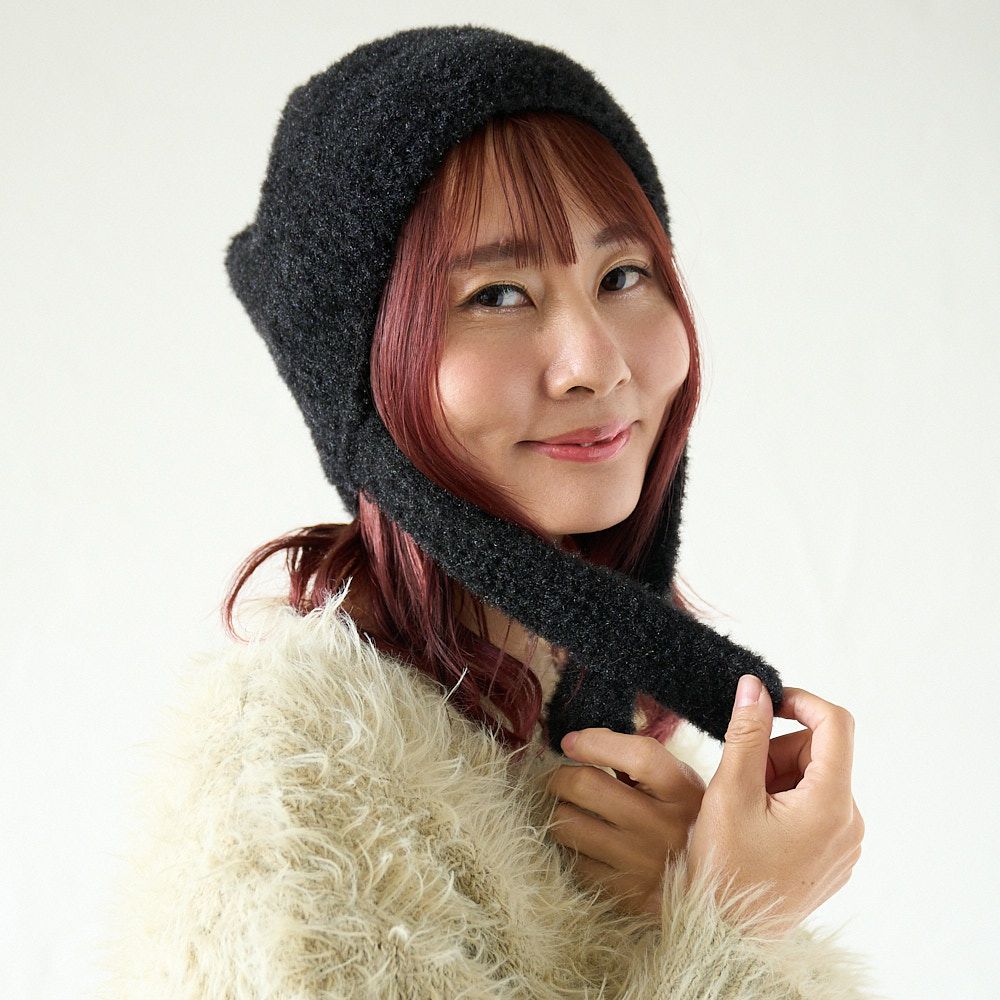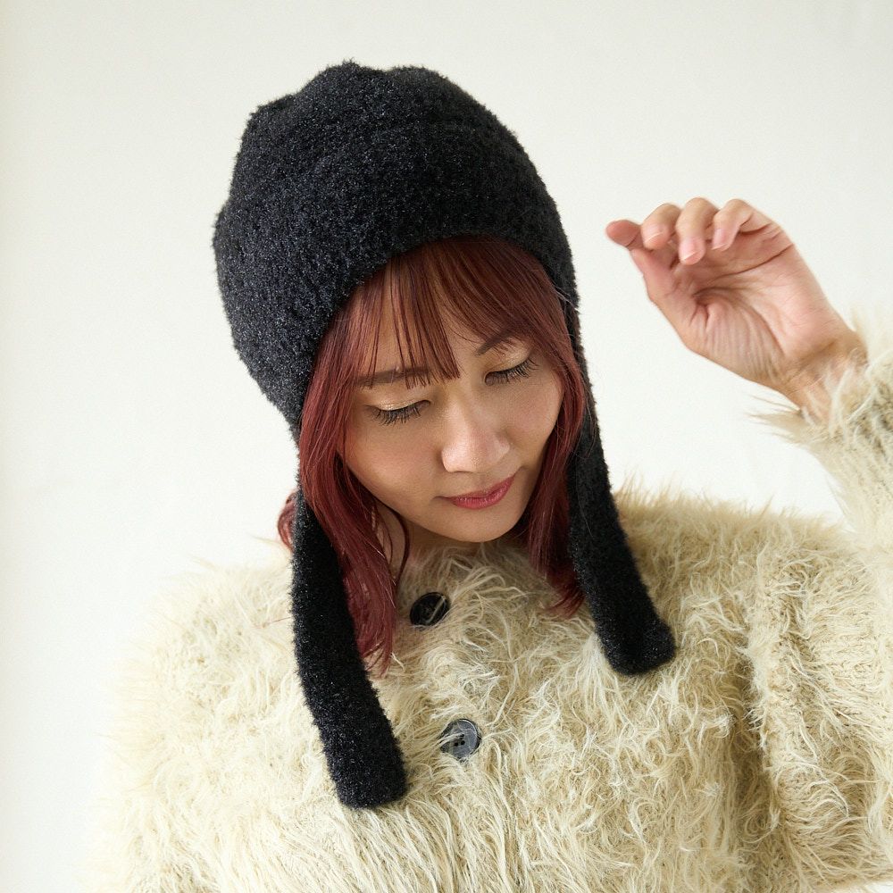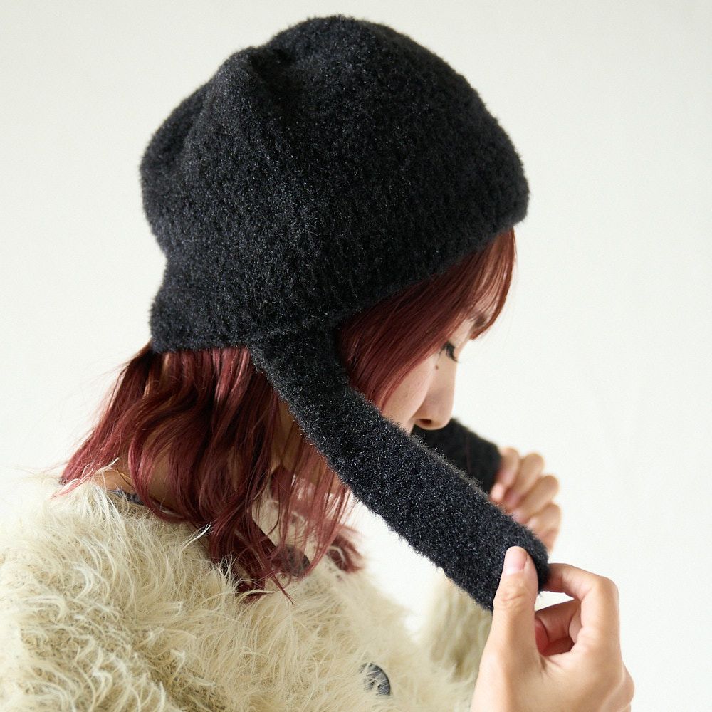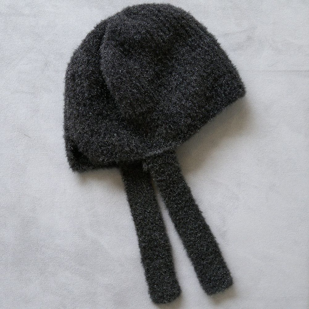 手編み 締め付け感のない 紐付きニット帽(ブラック)