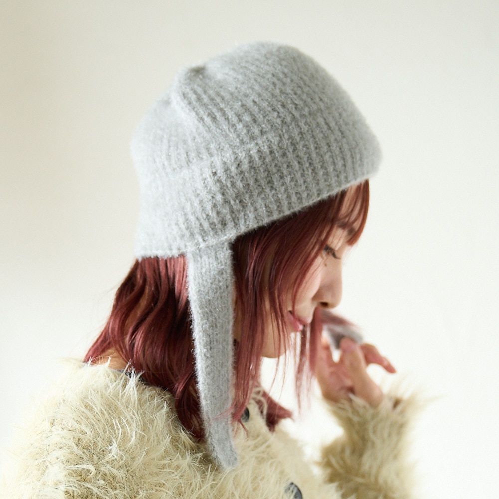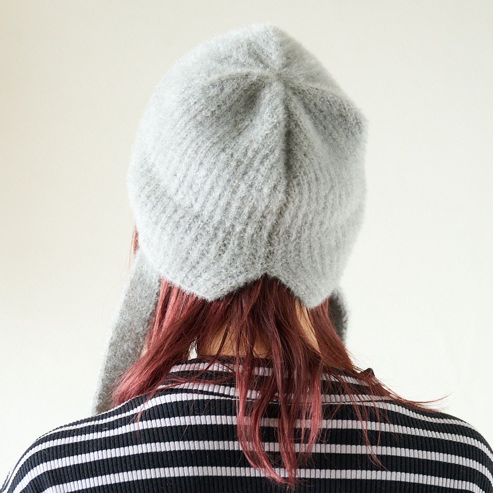 手編み 締め付け感のない 紐付きニット帽(グレー)