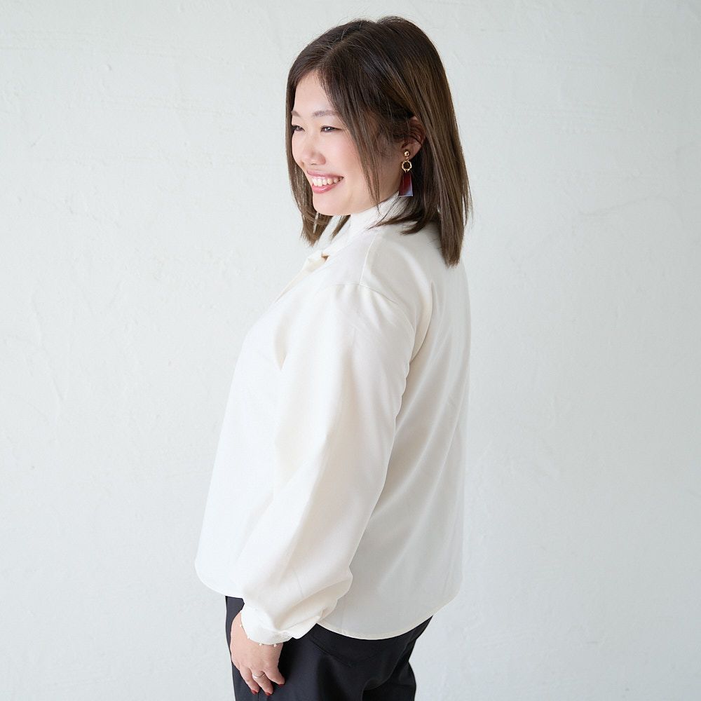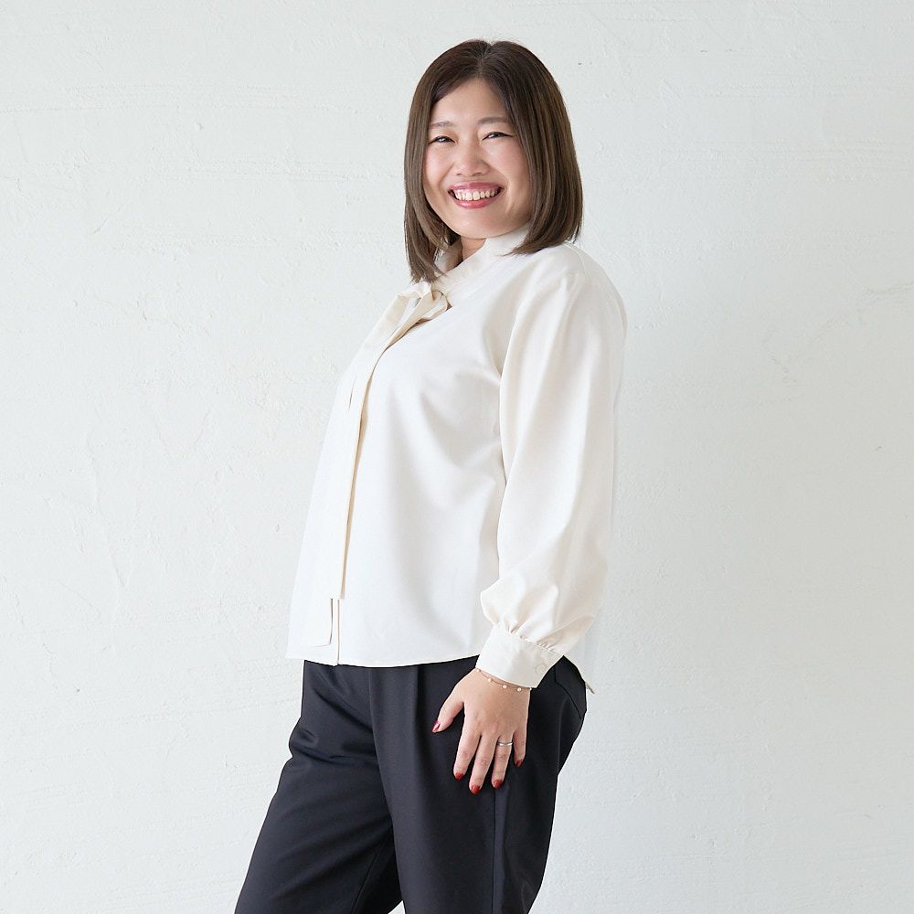 大きいサイズ とろみ素材ボウタイ長袖ブラウス(ホワイト)